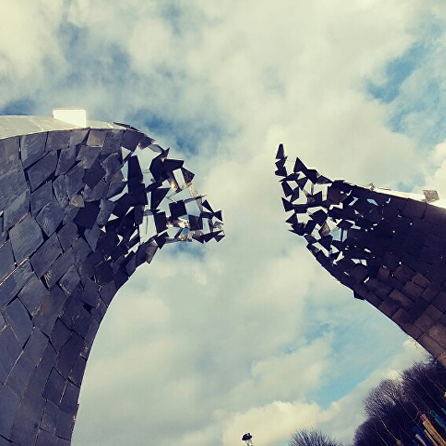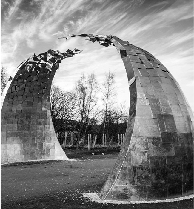 Evolve Entrance to Cuningar Loop ParkGlasgow, Scotland UKMedium : Polished 316L stainless steelDimensions : 5.5 metres high Evolve 2016 – Dimensions 5.5 metres high x 4.5 metres wide – 316L stainless steel Evolve location in Glasgow